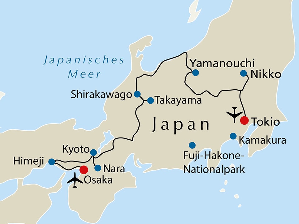 Am 9. Tag erwartet uns ein weiterer Höhepunkt. Wir fahren nach Himeji zur „Burg des weißen Reihers“ (Eintritt inkl.). Die größte und schönste Burg Japans aus dem 17. Jhd. erstrahlt in ganzer Pracht. Sie ist vollkommen zu Recht ein besonderes UNESCO-Weltkulturerbe. Umgeben wird sie von einem wunderschönen Park (Eintritt inkl.). Anschließend fahren wir zurück zur Flughafeninsel Kansai. Von dort heißt es Abschied nehmen vom Zauber des Landes der aufgehenden Sonne. Mit schönen, unvergesslichen Erinnerungen im Gepäck landen wir an Tag 10 glücklich in unserer Heimat.